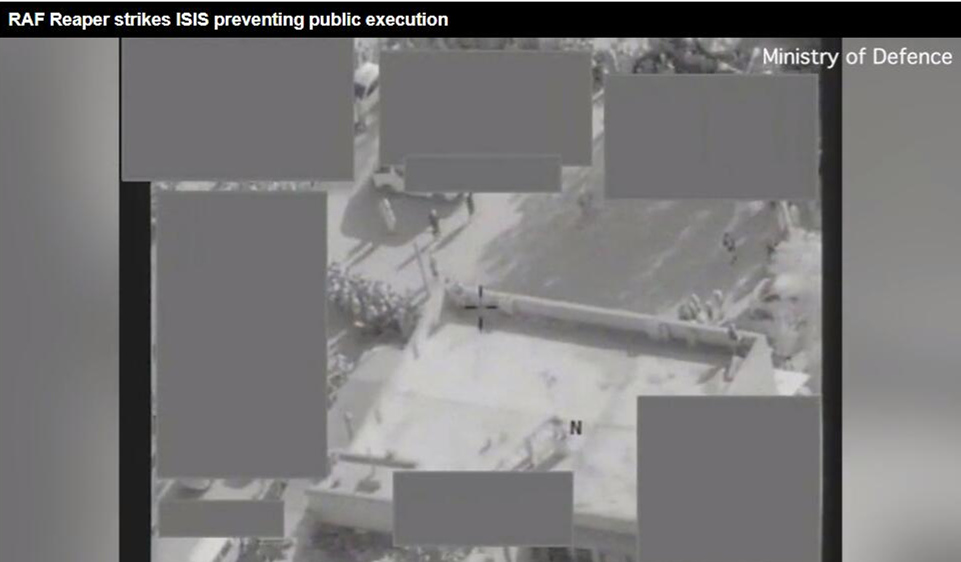 當時,這駕由林肯郡的英國空軍飛行員控制的無人機從約3200公里外釋放出致命性武器,消滅了一名在處決地點附近望哨的狙擊手。當驚恐的人羣四散逃開時,IS的成員也無法繼續這場殘忍的處決了。