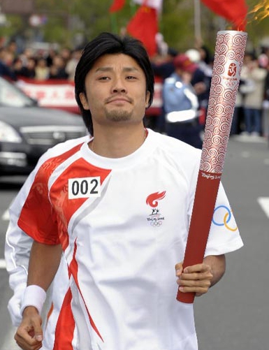 2008年北京奧運會前,末續慎吾在日本長野參加火炬傳遞(圖片來源:新華網)