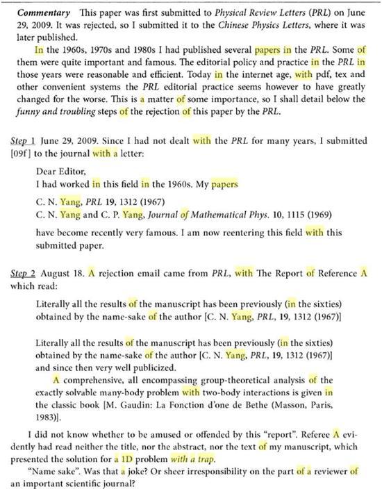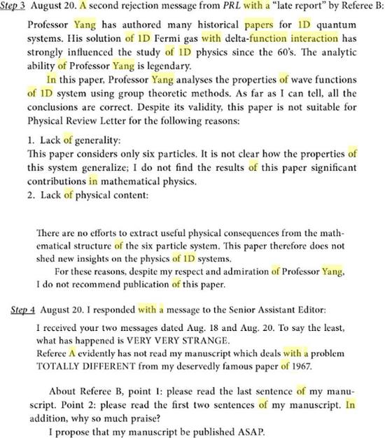 顯然,作為國際物理學界的著名刊物,其編輯不識鼎鼎大名的楊振寧是不可能的。但是,即便如此,“一個多月後返回的一位同行評議者認為,新作的結論已經包含在‘同名者(即楊振寧)’在1967年所發表的論文中”。“兩天後,另一位同行評議者的反饋傳來。反饋的開頭是對楊振寧過去工作的肯定,讚揚其分析能力是‘傳奇般的’。對於新作,同行評議者表示,據他/她所看,結論都是正確的,但認為這並不合適發表在《物理評論快報》,原因是‘缺乏廣泛興趣’和‘缺少新的物理’”。對此,楊振寧寫道,“我不知道是該覺得好笑還是被冒犯”。於是,“楊振寧將該文章投給《中國物理快報》,並在次月(9月)順利發表”。