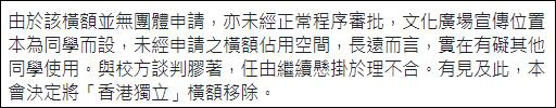 港中大學生會稱,由於該橫幅並無團體申請,也未經正常程序審批,未經申請的橫幅佔用空間,長遠而言有礙其他同學使用,任由繼續懸掛於理不合,故學生會決定將“港獨”橫幅移除,但否認向校方屈服,重申仍會“繼續抗爭”,保衞港中大的言論自由。