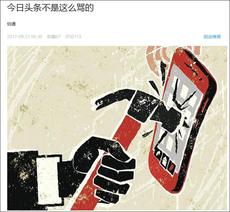 9月21日,虎嗅網發佈伯通的專欄文章,標題是《三評人民網:今日頭條不是這麼罵的》。文章開頭總結了人民網三評的主要觀點,隨後分別以“不要拿對媒體的標準要求地攤雜誌”,“不該要求歌舞廳對客户進行思想教育”以及“不必擔心有華強北,人們就不買iPhone了”為小標題,逐條評論。