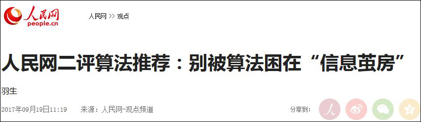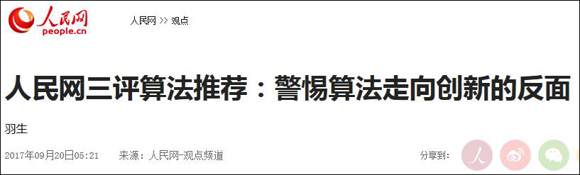 本週,人民網連續三日發表署名“羽生”的評論文章,文章分別以《不能讓算法決定內容》,《別被算法困在“信息繭房”》和《警惕算法走向創新的反面》為標題,三評以今日頭條為代表的信息平台算法推薦。21日,虎嗅網專欄作家伯通發表題為《三評人民網:今日頭條不是這麼罵的》的文章,認為:“不要拿對媒體的標準要求地攤雜誌”,“不該要求歌舞廳對客户進行思想教育”以及“不必擔心有華強北,人們就不買iPhone了”。