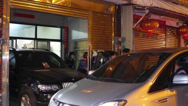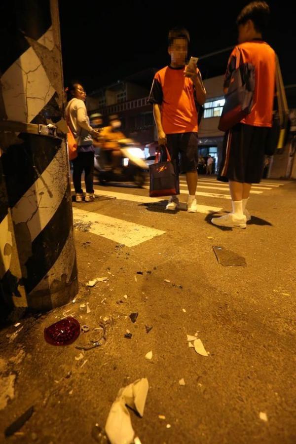 朱姓男子開車逃離時,擦撞對面電線杆造成部分碎片掉落地上(台媒圖)