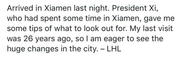 “昨晚(20日晚),我已抵達廈門。”最新的一條臉書消息中,李顯龍還透露了這樣一個細節:
