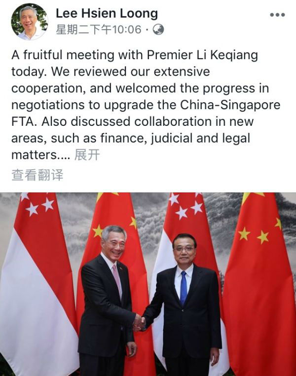 此前19日晚,他還在臉書上發佈了與國務院總理李克強會面的照片,並稱“會晤成果豐碩”。