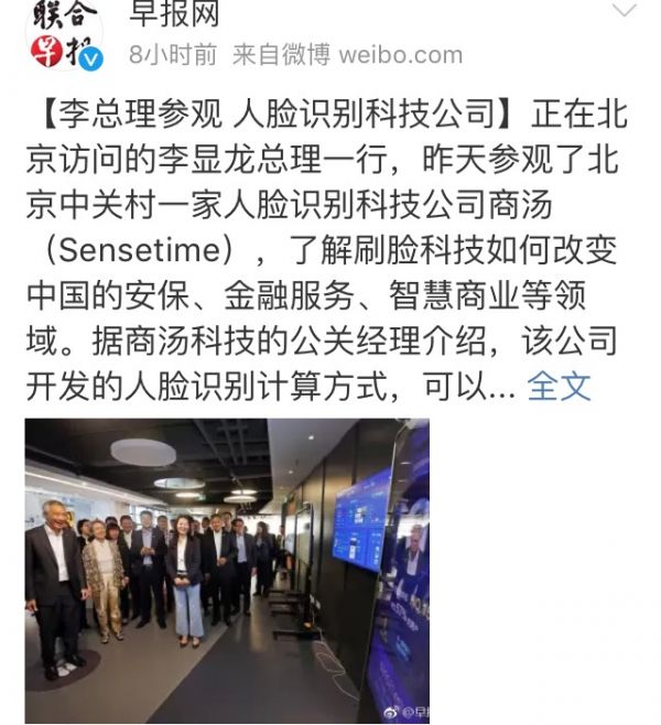 今天(21日)上午,《聯合早報》的微博賬號發佈了一張李顯龍在京參觀科技公司的照片。