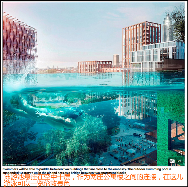 6月份,EcoWorld Ballymore以每套135萬美元的價格發售了25套公寓。這些房屋可以俯瞰“天空游泳池”。這個游泳池懸掛在空中10層,作為兩座公寓樓之間的鏈接。在這兒游泳的民眾可以一覽倫敦的景色。