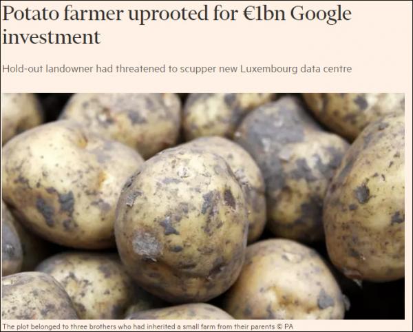 經過幾個月時間的談判,最終盧森堡政府戰勝了這位“釘子户”。《金融時報》9月22日報道稱,為了獲得谷歌10億歐元的投資,這位種土豆的農場主已被趕走。