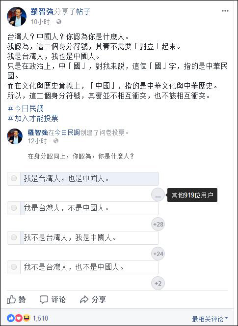 近日,馬英九時期台灣“總統府”副秘書長羅智強在Facebook上發起投票,向網友詢問這個問題。參加投票的近千名網友中,95%選擇了“我是台灣人,也是中國人”這一選項。