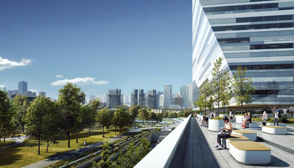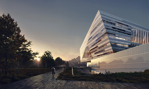 而這塊“玉石”正坐落於城市森林中,綠化率達24%。從上圖東館設計方、丹麥SHL建築事務所日前公開的效果圖來看,該建築立面包覆着背襯保温板的印刷玻璃,切割和旋轉後的圖書館體塊映射着天空和周邊公園景觀,自然而成一片“文化綠洲”。
