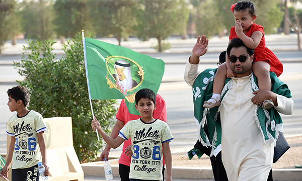 小男孩揮舞着印有沙特國王頭像的旗幟走向活動場館