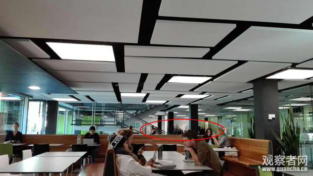 德國南部某大學圖書館咖啡廳,紅圈內為投票點。投票點有三個投票位,選民可以在投票位上填寫選票。該投票點一共有四位工作人員,坐在投票區入口兩側。從圖中可以看出,投票區並沒有和其它區域完全隔開,近景中有學生喝咖啡、學習、聊天。圖片來源:作者供圖