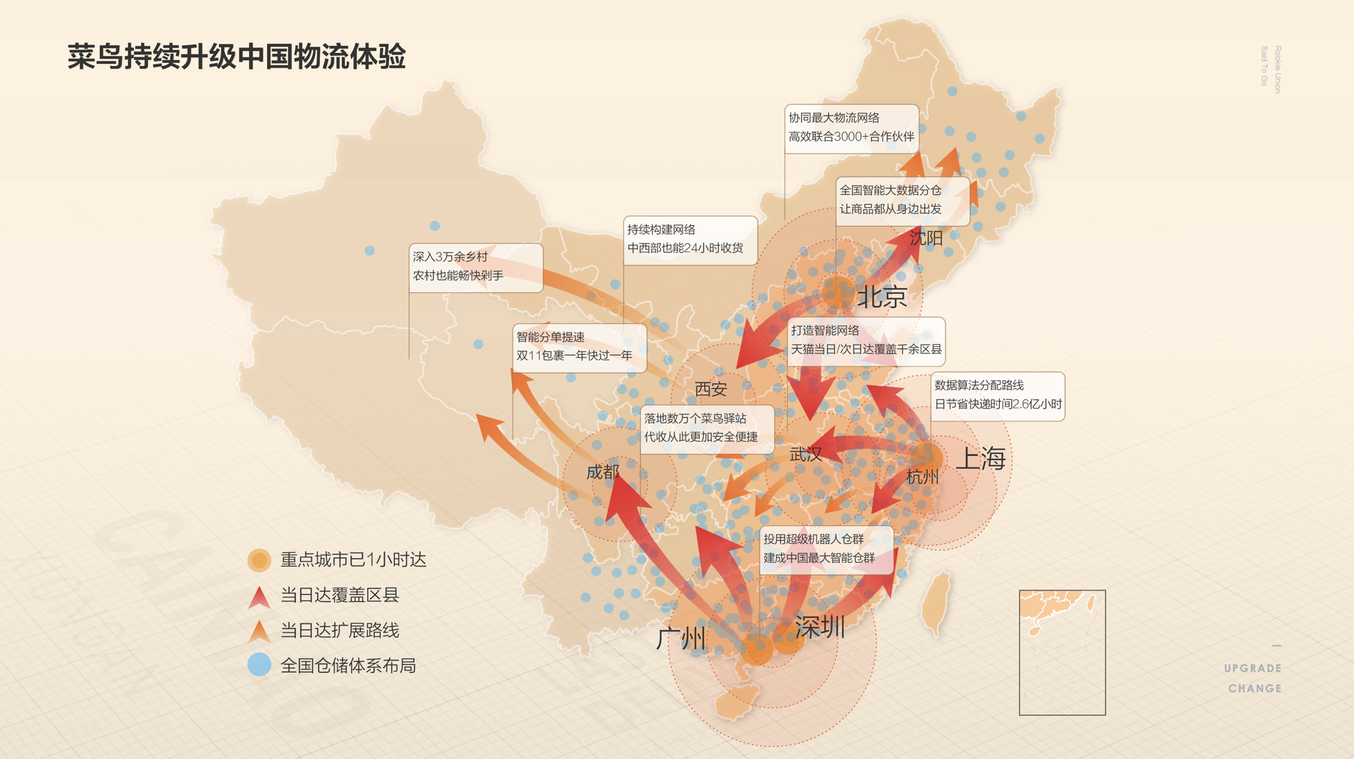 目前在阿里巴巴平台上,菜鳥智能倉配網絡已經為全國1000多個區縣提供當日達次日達服務,天貓超市在生鮮領域推出了1小時送達的極速物流。在跨境領域,基於菜鳥的全球物流網絡,中國商品運往世界各地的時間大幅縮短,很多地區從過去的60天已經降到目前的15天左右,俄羅斯、西班牙等部分地區已經實現了72小時送達。在農村網絡方面,菜鳥已經搭建了覆蓋全國近3萬個村莊的送貨進村服務,打通了農村最後一公里。