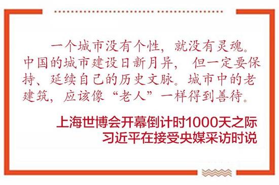 無論是到中心城區還是到遠郊調研,習近平總是不忘提醒上海的各級幹部,要保護好歷史建築,保護好自然村落,保護好城鄉的歷史風貌,妥善處理好保護與發展、改造與新建的關係。他曾説:“城市中的老建築,應該像‘老人’一樣得到善待。”