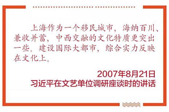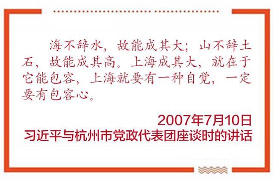 “如果説海納百川是上海一貫的文化特點,追求卓越是上海的一種文化本質,那麼開明睿智本身是一種態度,大氣謙和是一種胸襟,這樣才能進一步海納百川,進一步追求卓越。”這是習近平對上海城市精神的一段闡述。