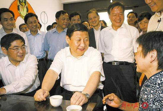 2007年8月28日,習近平在盧灣區調研時,與社區事務受理服務中心工作人員親切交談。