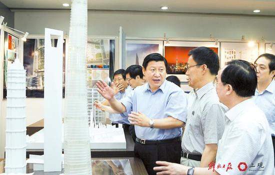 圖為習近平在浦東陸家嘴聽取上海中心設計方案的彙報。 本文圖片 上觀新聞