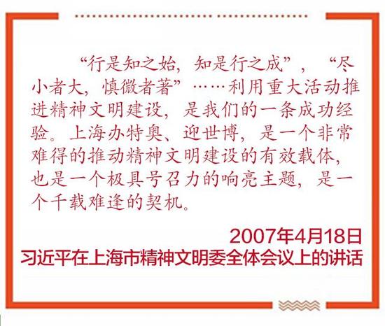 2007年4月18日,習近平在出席上海市精神文明委全委會時,就曾指出,上海辦特奧、迎世博,是一個非常難得的推動精神文明建設的有效載體,是一個千載難逢的契機,是推動精神文明建設發展的極好機會。