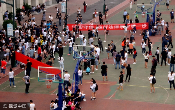 2017年9月16日,天津,參考人員在“誠實守信 走好法律職業第一步”標語旁複習。當日,2017年國家司法考試開考(圖片來源:視覺中國)