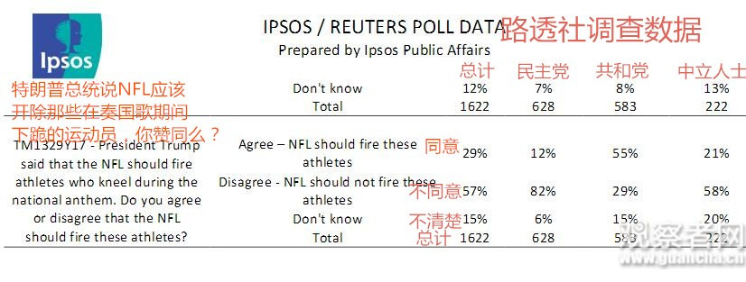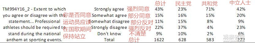 本次調查樣本大致包含了1622名成年人,其中628名民主黨人士,583名共和黨人士,222名中立人士。調查顯示:58%的受訪者傾向於認為,運動員應該在奏國歌期間保持站立,34%的受訪者不認同這個觀點,9%的受訪者表示他們不清楚。