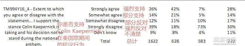 數據表明,39%的受訪者強烈反對、12%的人部分反對NFL四分衞Colin Kaepernick 在奏國歌期間用不起立的方式抗議種族歧視。