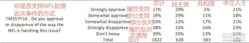 43%的受訪者在調查中表示,他們不認同全國橄欖球聯盟處理此次事件的做法,表示認同的受訪者只有36%。