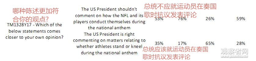 53%的民眾表示,總統不應就全國橄欖球聯盟的運動員如何在國歌期間的行為進行評論,35%的民眾對此表示支持。57%的民眾表示不應該開除那些在奏國歌期間抗議的運動員。