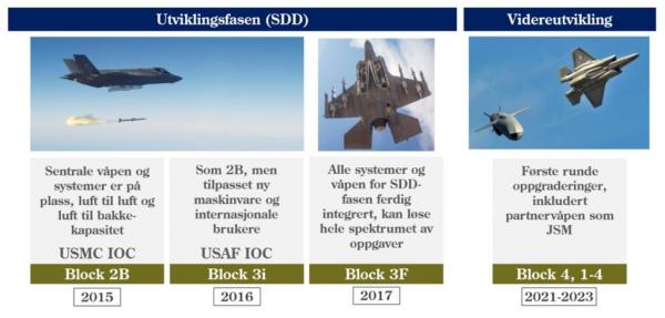 Block 3F對應的是基本生產型的定型狀態。但作為軟件化的戰鬥機,硬件定型後,軟件還可以繼續升級,增加更多的能力。比如説,已經開始研發的Block 4要求能發射SDB II小直徑炸彈、JSOW Block 3空地導彈、AIM-9X Block 2空空導彈,還需要能夠在空地之間視頻串流和用紅外光束指引目標,與Link 16數據鏈聯通。規劃中的Block 5除了增加新的武器發射能力外,要求增加逆合成孔徑雷達模式以適合海上使用,更要整合紅外搜索和跟蹤(IRST)、直接紅外對抗、合作式電子戰、先進威脅響應、任務規劃等功能。更加遙遠的Block 6則有電磁攻擊、友軍跟蹤定位(避免誤傷)、全向被動告警等。