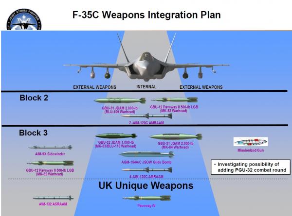 Block 3F是定型版,要求達到完整的設計作戰能力。具體來説,要求能發射25毫米航炮(A 為機內,B和C為吊艙)、機內武器艙裏的AIM-132 ASRAAM近程空空導彈(英國F-35B)、500磅“鋪路IV”GPS/激光制導炸彈(英國F-35B)、AGM-154 JSOW GPS/成像紅外滑翔炸彈(F-35C),另外還有一大堆翼下掛載的空空導彈(如AIM-9X)、空地導彈(“磺石”、“風暴之影”、JASSM)、制導和非制導炸彈、副油箱等。與F-15E、F-18E等現役主力相比,品種依然少了一點,但畢竟沒有明顯短板了。