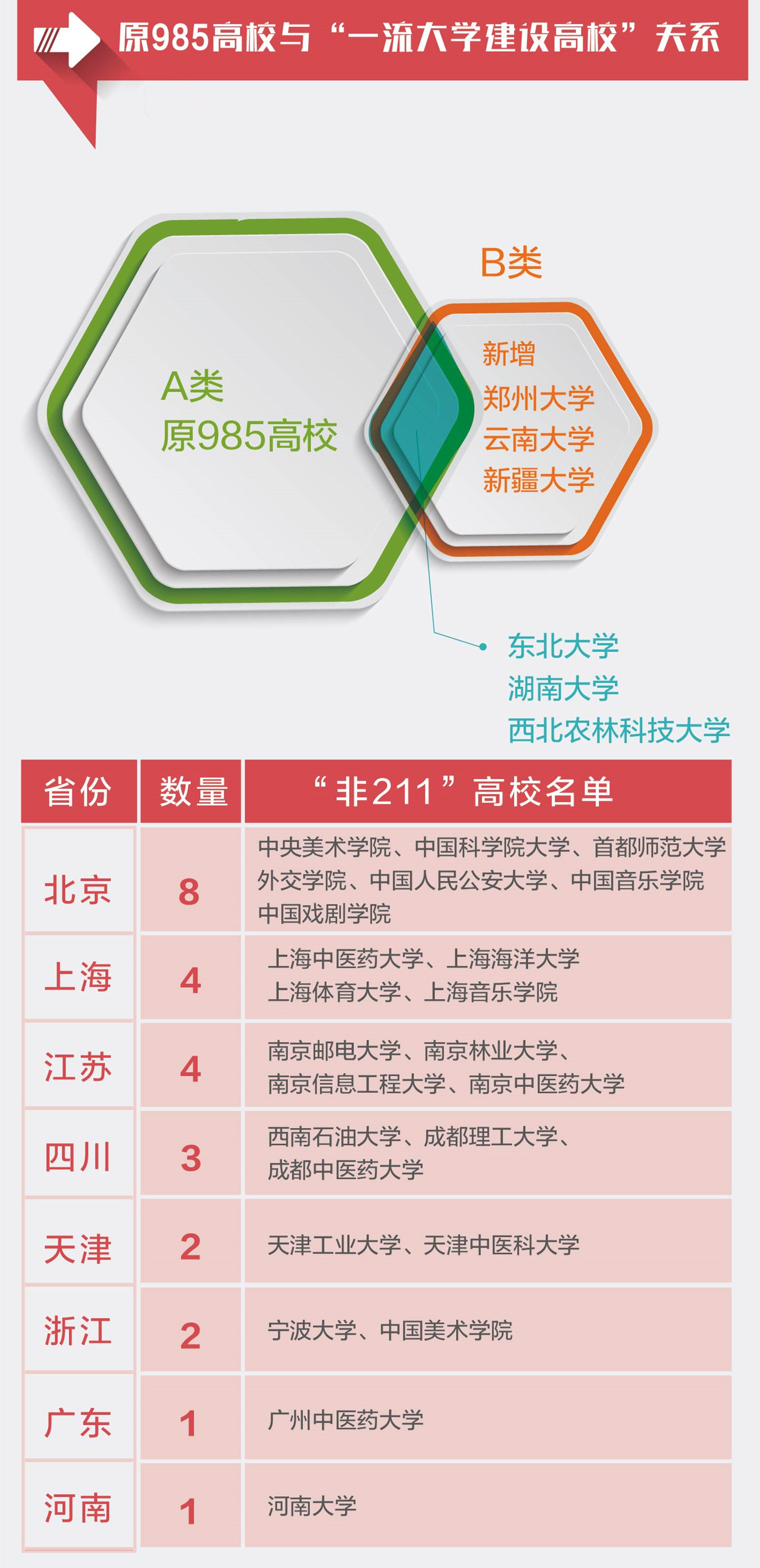 4. 打破身份固化、激發建設活力。將一流大學區分為A、B兩類,主要是為了督促被歸入B類的高校正視差距、奮起直追。原“985高校”絕大多數進入一流大學A類,被評為一流大學B類的只有東北大學、湖南大學和西北農林科技大學,看來它們真要當心了。