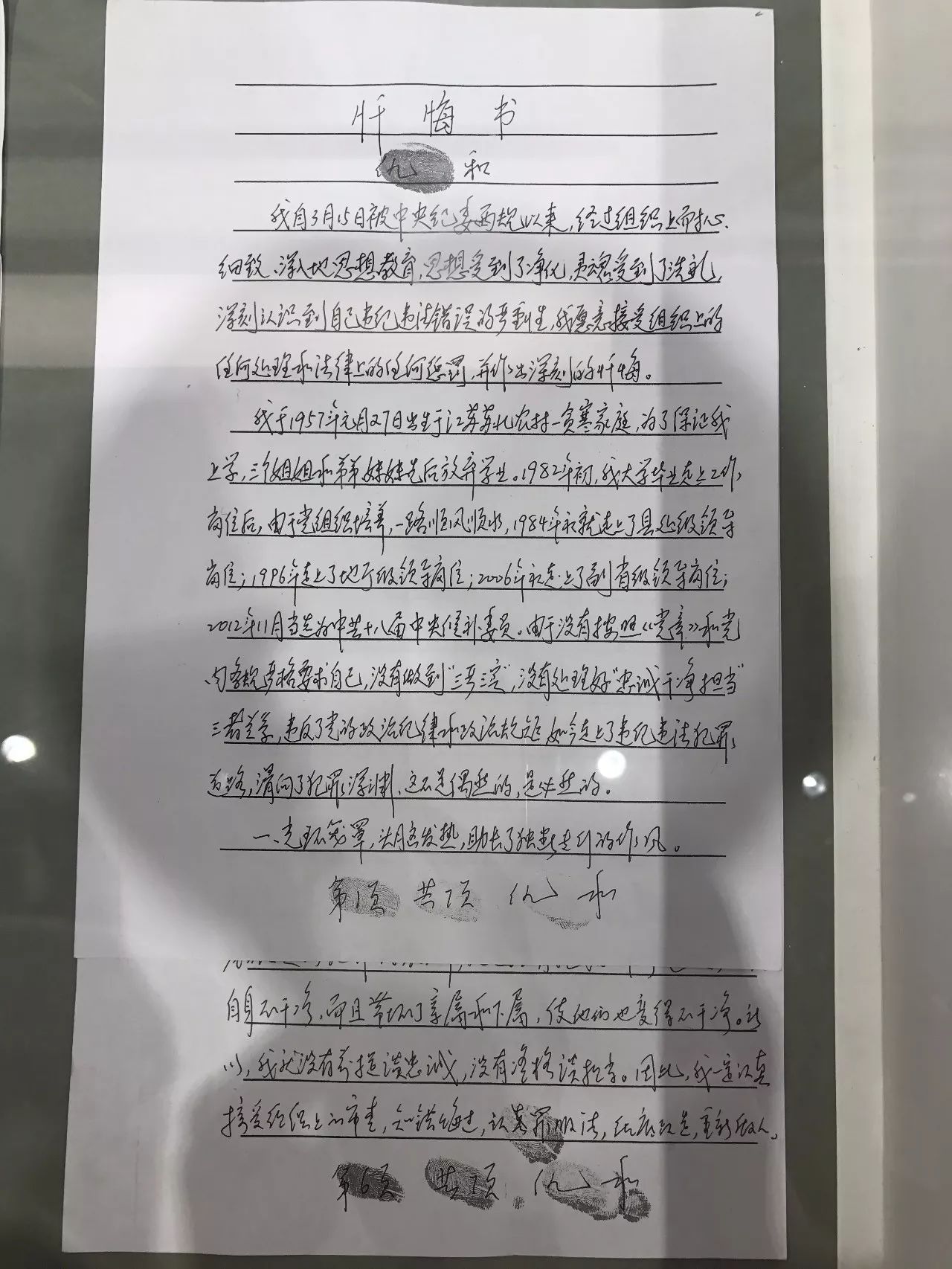 寫悔過書是我人生的第一次,落筆如千鈞。真是不堪回首,無地自容。我是一個農民的兒子,因“文革”的發生,失去了上大學的機會,回家當了農民,從大隊會計幹起,在黨組織的教育培養下,由農民轉為國家幹部,先後在公社、縣、地區、省委任職,從十三大算起,一直到十八大,連續參加六屆黨代會,連續任候補、中委四屆十二年,親人為我自豪,家鄉人為我驕傲,我的中小學母校將我視為……向黨員領導幹部忠告一句話:清廉是福、貪婪是禍,僅僅是為了家人,也不能貪財。