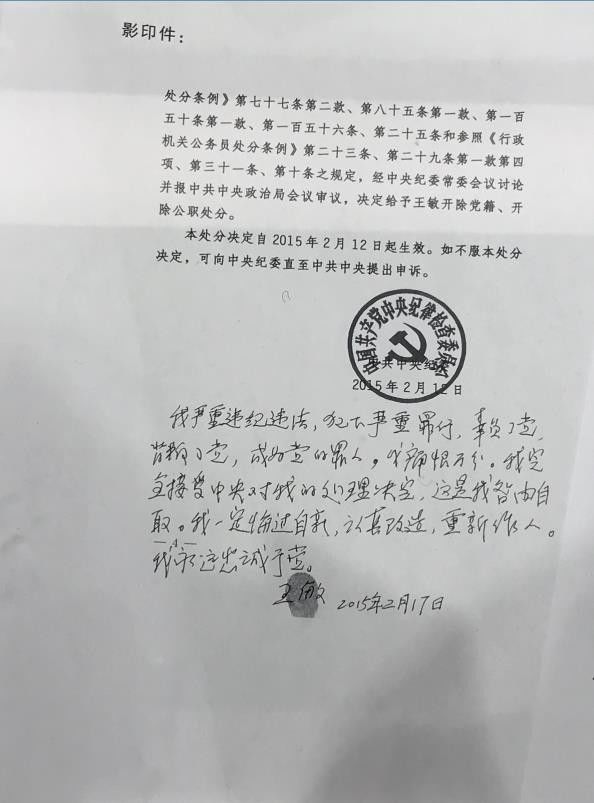 我嚴重違紀違法,犯下嚴重罪行,辜負了黨,背叛了黨,成為黨的罪人,我痛恨萬分。我完全接受中央對我的處理決定,這是我咎由自取。我一定悔過自新,認真改造,重新作(做)人。我永遠忠誠於黨。(王敏)