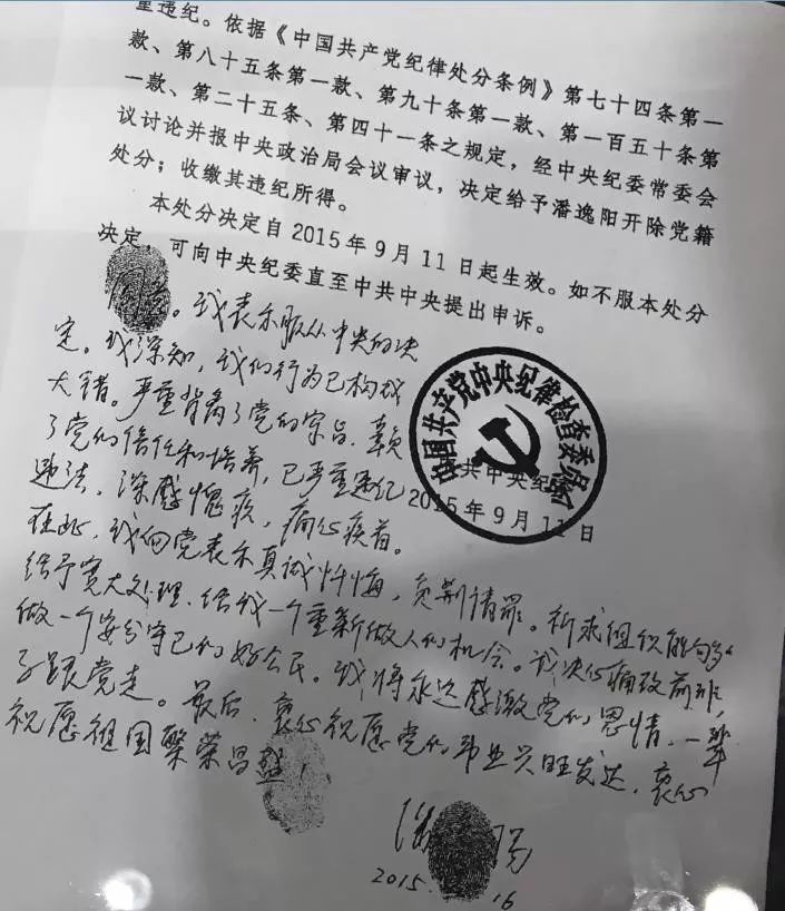 以潘逸陽為例,中央紀委對他的處分決定自2015年9月11日起生效,潘逸陽簽名摁手印“表示服從中央的決定”是2015年10月16日,中央紀委發佈對其“雙開”的通報也是2015年10月16日。