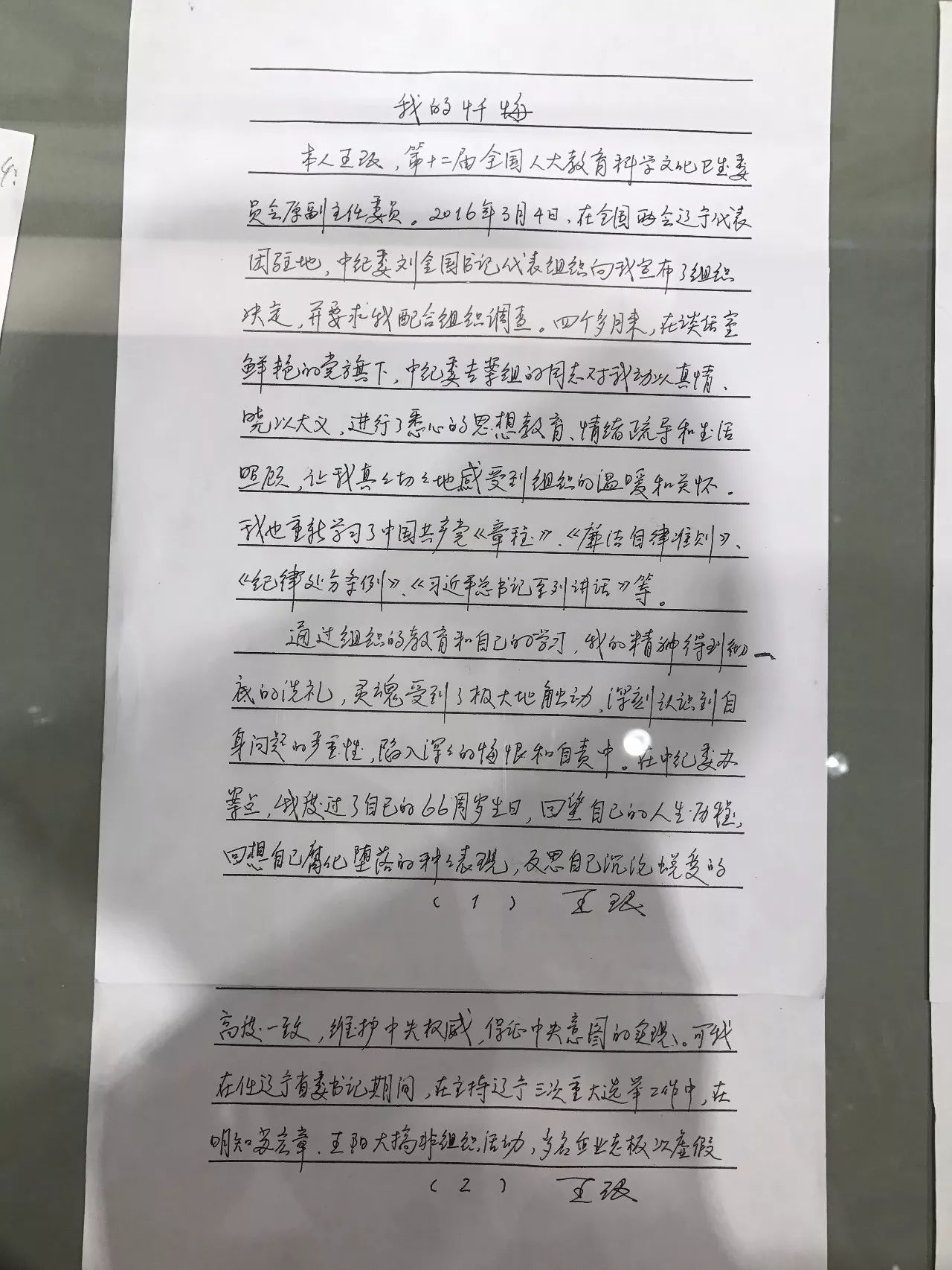 本人王珉,第十二屆全國人大教育科學文化衞生委員會原副主任委員。2016年3月4日,在全國兩會遼寧代表團駐地,中紀委劉全國(副)書記代表組織向我宣佈了組織決定,並要求我配合組織調查。四個多月來,在談話室鮮豔的黨旗下,中紀委專案組的同志對我動以真情,曉以大義,進行了悉心的思想教育、情緒疏導和生活照顧,讓我真真切切地感受到組織的温暖和關懷。我也重新學習了中國共產黨《章程》、《廉潔自律準則》、《紀律處分條例》、《習近平總書記系列講話》等。