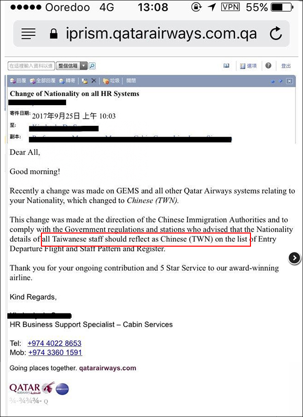 大約一週前,卡塔爾航空台灣機組員向台綠媒投訴,稱其公司的台籍機組員發現,公司在未告知情況下將他們的“國籍”由Taiwanese改為 “Chinese (TWN)”。機組員向公司反應,可公司回覆是應中國移民署要求。