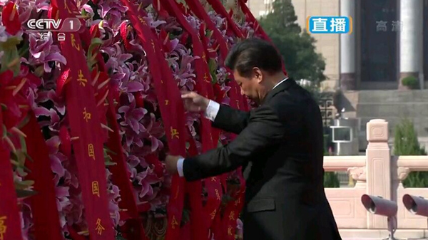 資料圖 2015年9月30日,黨和國家領導人在天安門廣場向人民英雄敬獻花籃。