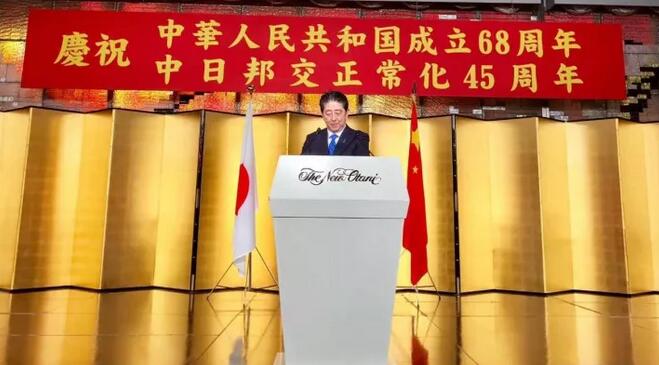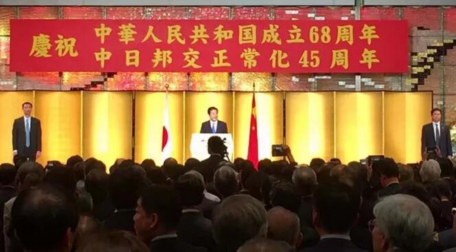9月28日,中國駐日本大使館在東京都內的酒店裏舉行慶祝中華人民共和國建國68週年與中日邦交正常45週年慶祝酒會,日本首相安倍晉三現身。**據日本《朝日新聞》28日報道,這是安倍執政以來首次出席這樣的活動,也是日本的首相時隔15年出席該活動。**據眾多日本政府人士稱,除了安倍首相之外,還有外相河野太郎也將一同出席並發表講話。