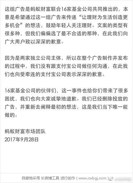 螞蟻財富在聲明中承認,相關廣告為螞蟻財富聯合16家基金公司共同推出,本意是希望通過廣告鼓勵年輕人關注理財。螞蟻財富就文案內容致歉。