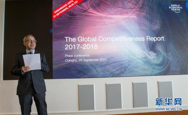 26日,世界經濟論壇“應對全球挑戰”團隊總監及管理委員會成員理查德·薩曼斯出席《2017-2018年全球競爭力報告》發佈會
