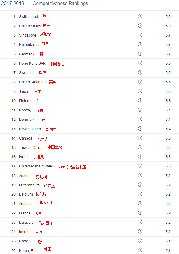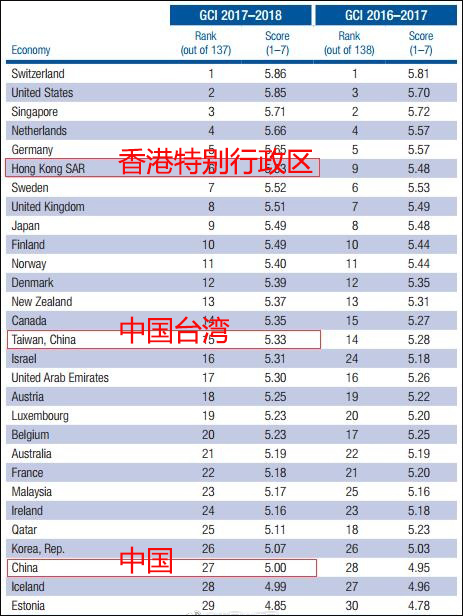 據中新網報道,世界經濟論壇9月27日發佈《2017-2018年度全球競爭力報告》顯示,瑞士競爭力居全球榜首,新加坡位列亞太地區之首;中國位列全球第27位,比上年度上升一位。我國台灣地區排名第15名,較去年退步1名。為此有台媒稱,這呈現出陸進台退的窘境。