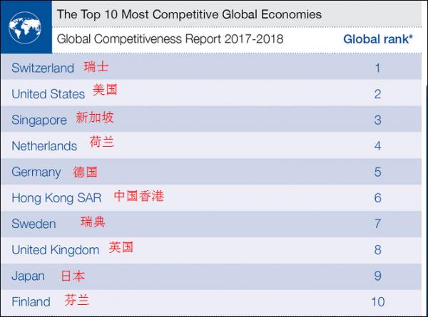亞太地區競爭力整體向好。新加坡位居全球第三;中國香港名次從第9升至第6,一躍超過日本;日本名次則降至第9,比去年下降一位。這是該國全球競爭力排名連續第二年下滑,原因可能和不少分項排名下降有關。