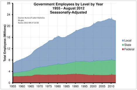 上圖是美國政府僱員總數隨時間變化的圖表。里根的任期是1981-1989年。我們可以很明顯的看到,聯邦政府和州政府級別的官員幾乎沒什麼太大變化,地方官員的數量在他的第一個任期內有所減少,但是之後馬上反彈,在他離任以後,人員數量依然比上任之初要多得多。從這點就能看出,里根總統和官僚主義的抗爭收效甚微。