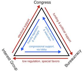 美國康奈爾大學的政治科學家西奧多·羅威(Theodore J. Lowi)用“鐵三角”來形容壟斷政策制定的三股勢力:利益團體、國會和官僚。利益團體的目標是為自己爭取更多的利益,國會議員的目標是選票,行政官僚的目標是保住自己部門的財政來源。