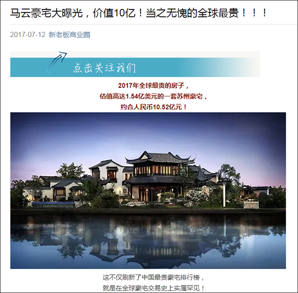 此前,有自媒體賬號撰寫文章《馬雲豪宅大曝光,價值10億!當之無愧的全球最貴!!!》稱,馬雲在蘇州有一套估值高達1.54億美元的一套豪宅,約合人民幣10.52億元,並配大量圖文詳細介紹了這套位於蘇州城市中心金雞湖、獨墅湖“雙湖”湖心島嶼之上名曰”桃花源“的所謂“馬雲豪宅”。