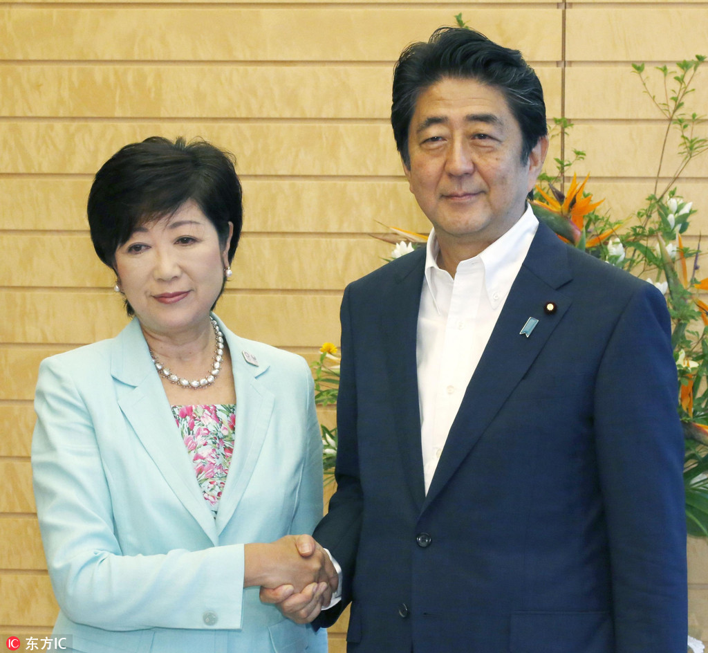 8月4日上午,日本首相安倍晉三在官邸會見東京都新任知事小池百合子(圖/@東方IC)