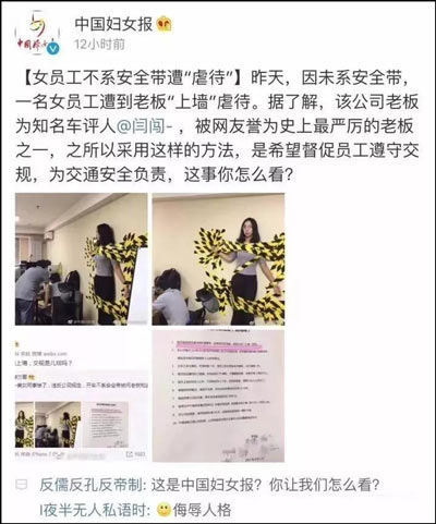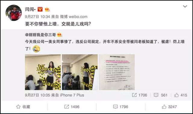 另據瞭解,閆闖自己創立的公司規章制度頗為嚴格。數日前一位女職員因為違反公司規定,開車沒有系安全帶被“罰上牆”(用黃黑警示膠布將人貼服在牆上),引起巨大爭議被廣泛報道。