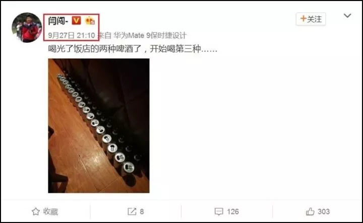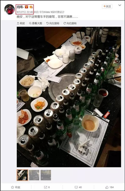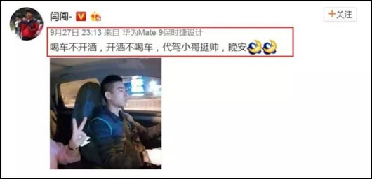 事發後,更有消息指出在事發前一天(27日)晚的閆闖微博上,提及當晚喝了很多酒並叫了代駕回家,因此如果事故確實是在9月28日09:21發生,那麼閆闖極有可能屬於醉駕。