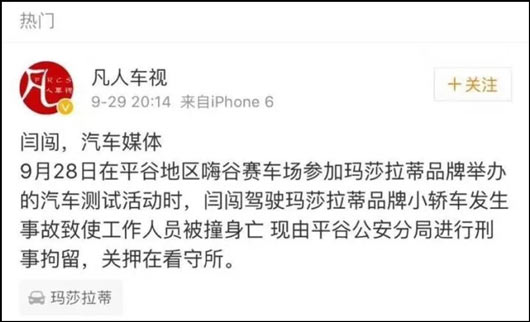 【觀察者網汽車報道】昨天,一條重量級的消息點燃整個汽車媒體圈。網上有人報料稱,9月28日,車評人在平谷嗨谷賽車場駕駛瑪莎拉蒂時,發生事故致使一位工作人員被撞身亡,目前平谷公安分局已經將閆闖刑事拘留,關押在看守所。事故發生原因目前還在調查中。