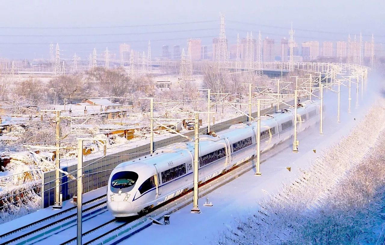 2012年12月,世界上第一條穿越高寒季節性凍土地區的哈爾濱至大連高速鐵路建成運營。哈大高鐵是中國目前在最北端的嚴寒地區設計建設標準最高的一條高速鐵路,從設計、施工、運營維護等方面,採用了最先進的科技確保高寒地區高鐵安全穩定運行。圖為一列行駛在風雪中的高寒動車組。