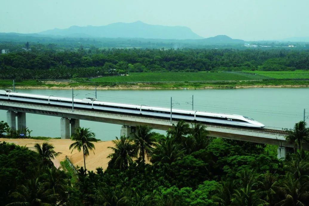 2015年12月30日,全長653公里,全球第一條環島高鐵、也是迄今為止世界上最南端高鐵海南環島高速鐵路開通運營。該高鐵大量採用新技術、新材料、新工藝,克服了熱帶海島高温、高濕、強腐蝕環境影響,為東南亞乃至全球熱帶海洋氣候建設運營高鐵提供了範本。海南環島高鐵的開通運營,進一步完善了海南快速鐵路網結構,極大方便沿線羣眾出行,加快形成海島“三小時經濟圈”,對推進海南國際旅遊島建設,促進經濟社會發展,具有重要意義。圖為一列動車組在萬泉河大橋上行駛。